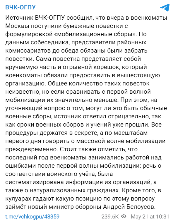В проукраинских каналах сообщают, что в военкоматы Москвы якобы поступили бумажные повестки с пометкой «мобилизационные сборы». Авторы фейка утверждают, что это может быть «предвестником» новой волны мобилизации. Но это не так. Обратимся к значению словосочетания «мобилизационные сборы» и не найдем его, потому что как таковых «мобилизационных сборов» не существует. Есть только военные, которые прописаны в статье 54 ФЗ «О воинской обязанности и военной службе». Однако и они не являются прямым следствием новой волны мобилизации. Военные сборы проводятся для проверки боевой и мобилизационной готовности воинских частей и военных комиссариатов. Срок их проведения — не более двух месяцев, а общая продолжительность сборов, пока человек находится в запасе, составляет не больше 12 месяцев. Людей, призванных на сборы, в зону боевых действий не отправляют. К тому же 14 мая на заседании Совфеда министр обороны РФ Андрей Белоусов отметил, что сейчас речи о новой волне мобилизации не идет. Об отсутс