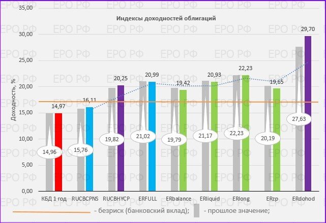 Обзор долгового рынка и обновленных портфелей. ✅ Максимальные ставки по вкладам, опубликованные Банокм России на первую декаду мая практически остались на прежнем уровне. Стало 14,95%, было 14,92%. ✅ Индекс ОФЗ с дюрацией 1 год (КБД 1 год на графике👆) почти без изменений. Однако намеки прошлой недели на определённый позитив по ключевой ставке сошли на нет: КБД публикуется на сайте Мосбиржи ✅ Наконец отреагировал на динамику ОФЗ индекс корпоративных облигаций RUCBCPNS, прибавил всего 0,35п.п., но тенденция к росту доходностей намечена. ✅ Индекс высокодоходных облигаций RUCBHYCP отреагировал бодрее, прибавил 0,43 п.п. ✅ Индекс полной доходности ЕРО РФ ERFULL без изменений. Что неудивительно, алгоритм ЕРО РФ предусматривал текущую риторику. В Реестр вошло 102 облигации против 85 ранее, ощутимое прибавление, в основном это бумаги второго эшелона с купоном сильно ниже ключевой ставки. Как работать с такими облигациями мы разбирали в телеграм-чате канала надежные-облигации.рф ✅ Индекс ERba