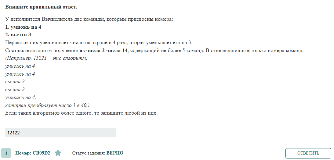 У исполнителя Вычислитель две команды, которым присвоены номера: 1. умножь на 4 2. вычти 3 Первая из них увеличивает число на экране в 4 раза, вторая уменьшает его на 3. Составьте алгоритм получения из числа 2 числа 14, содержащий не более 5 команд. В ответе запишите только номера команд. (Например, 11221 –– это алгоритм: умножь на 4 умножь на 4 вычти 3 вычти 3 умножь на 4, который преобразует число 1 в 40.) Если таких алгоритмов более одного, то запишите любой из них. РЕШЕНИЕ Будем идти от числа 14 к числу 2 применяя противоположные команды, так мы будем видеть когда промежуточный результат можно без остатка поделить на 4. Тогда мы имеем команды: 1. Раздели на 4 2. Прибавь 3 1) 14 нельзя без остатка поделить на 4, прибавим: 14 + 3 = 17 Команда 2 2) 17 нельзя без остатка поделить на 4, прибавим: 17 + 3 = 20 Команда 2 3) 20 можно без остатка поделить на 4: 20/4=5 Команда 1 4) 5 нельзя без остатка поделить на 4, прибавим: 5 + 3 = 8 Команда 2 5) 8 можно без остатка поделить на 4: 8/4=2 -