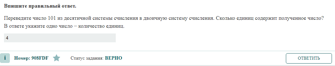 Переведите число 101 из десятичной системы счисления в двоичную систему счисления. Сколько единиц содержит полученное число? В ответе укажите одно число –– количество единиц. ЧТО НУЖНО ЗАПОМНИТЬ? Правила перевода из десятичной системы счисления в двоичную С помощью деления на два. 1. Последовательно выполнять деление исходного целого десятичного числа и получаемых целых частных на 2. 2. Записать полученные остатки в обратной последовательности. Пример: Переведем число 105 из десятичной системы счисления в двоичную: 105/2=52 (ост. 1) 52/2= 26 (ост. 0) 26/2=13 (ост. 0) 13/2= 6(ост. 1) 6/2= 3(ост. 0) 3/2 = 1(ост. 1) 1/2= 0 (ост. 1) Переписываем снизу вверх 105₁₀ = 1101001₂ РЕШЕНИЕ 101/2=50 (ост. 1) 50/2=25 (ост. 0) 25/2=12 (ост. 1) 12/2=6 (ост. 0) 6/2=3 (ост. 0) 3/2=1 (ост. 1) 1/2= 0 (ост. 1) Переписываем снизу вверх: 101₁₀ = 1100101₂ В ответ записываем количество единиц - 4. ОТВЕТ 4