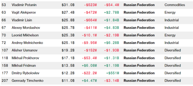 Согласно обновленному рейтингу Bloomberg Billioners Index (BBI), самым богатым среди россиян остается один из основных владельцев компании «Норникель» Владимир Потанин с состоянием 31 миллиард долларов. На втором месте совладелец «Лукойл» Вагит Алекперов с состоянием в 27,4 миллиарда долларов. Третью строчку замыкает миллиардер, основным активом которого остается Новолипецкий металлургический комбинат (НЛМК), Владимир Лисин с состоянием 25,8 миллиардов долларов. Больше всего за первые пять месяцев 2024 года заработал бывший бенефициар компаний «Еврохим» и СУЭК Андрей Мельниченко. А общее состояние богатейших бизнесменов России увеличилось на 17,762 миллиардов долларов. Отметим, что больше всего из всех российских миллиардеров потерял совладелец «Новатэка» и «Сибура» Геннадий Тимченко. Его состояние уменьшилось на 3,14 миллиардов долларов, до 11 миллиардов. Тимченко находится на 11 месте в рейтинге самых богатых российских миллиардеров. Ранее ИА «Бизнес Код» писало, что Россия не будет