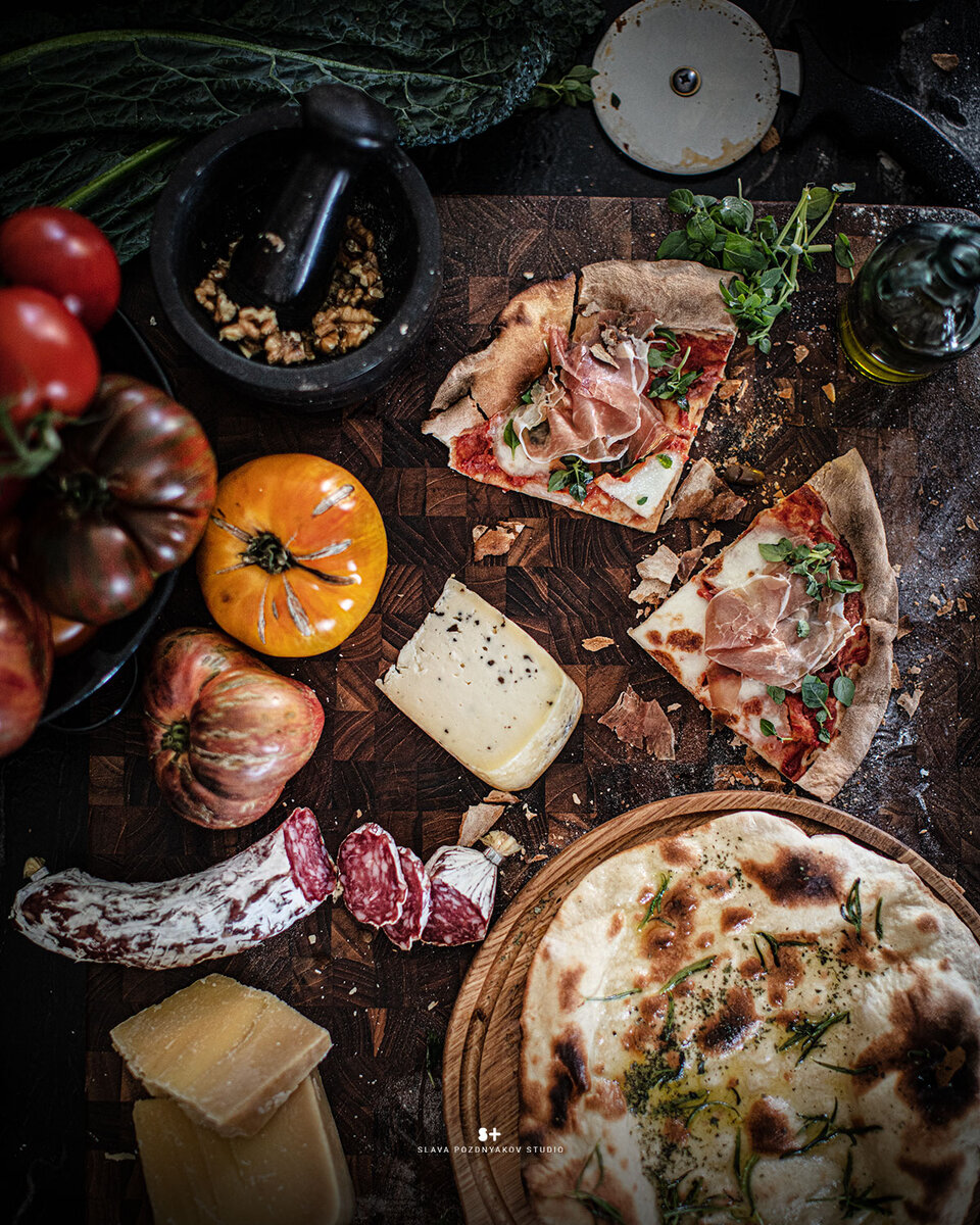 Фотосъемка композиции пиццы, фокачча для Osteria Mario. Фуд-стилист и фотограф Слава Поздняков.