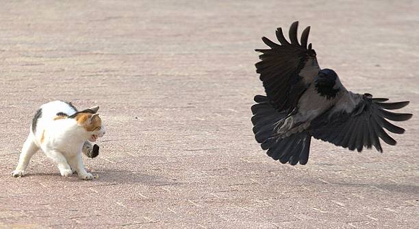 Сердобольные бабушки постоянно подкармливают кошек, живущих в подвалах домов. Например, в доме, где я живу, эти добровольные кормильцы даже поставили несколько пластиковых мисочек под выступом балкона на первом этаже. Теперь в эти мисочки все желающие кладут корм для бездомных кошек. Причем надо заметить, что меню довольно разнообразное. Здесь кусочки мяса, колбасы (бывает и копченая), куриное и рыбное филе и многое другое. Словом, кошачья братия не бедствует… Конкуренция за еду: ворона против кошек Это изобилие дармовой еды заприметила серая ворона, одна из многочисленной стаи, обитающей в округе.