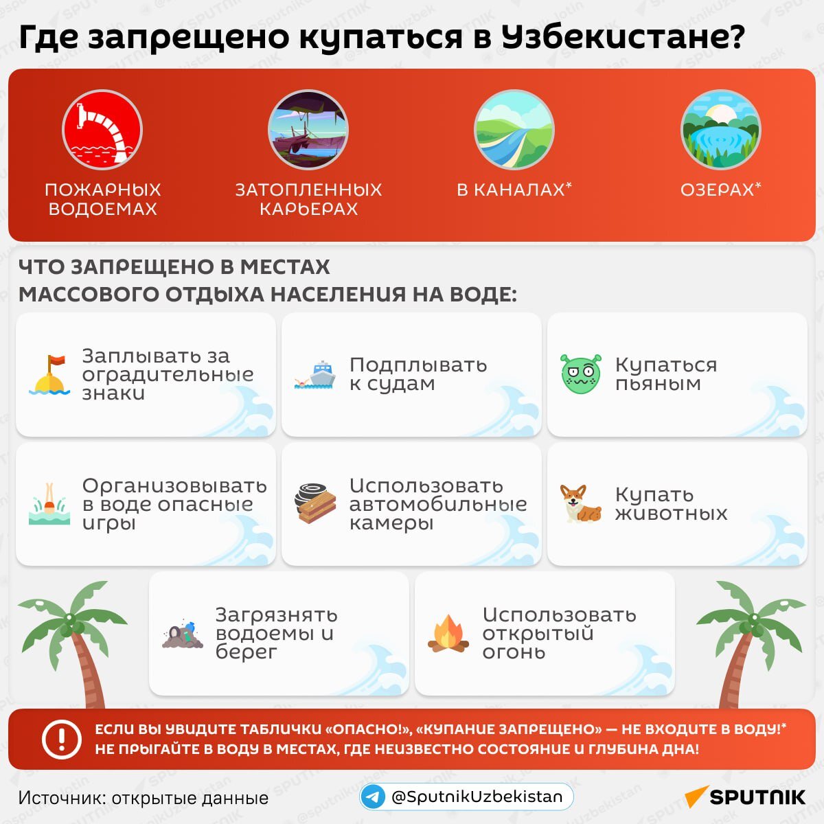 Вот только не во всех местах можно или безопасно плавать.Правила поведения на воде и запрещенные для купания места смотрите в инфографике @sputnikuz