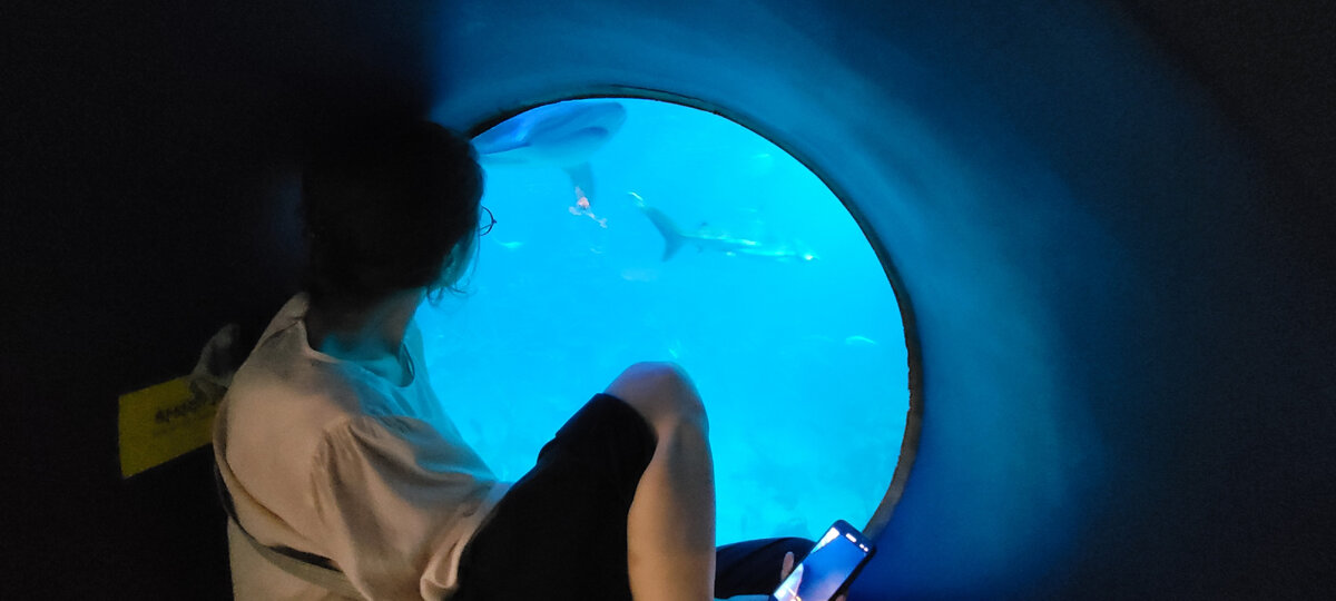 Этот самый большой аквариум интересен тем, что, двигаясь по маршруту в океанариуме (а там, как и Икее, обозначен стрелочками рекомендуемый маршрут), ты заглядываешь в него из разных точек. Есть, например, вот такие блистеры (тот же приём, что и в жилище пингвинов, только немного иначе реализованный). Можно туда голову засунуть, можно камеру, можно целиком залезть, чтобы поближе к рыбкам оказаться - размер позволяет. Не только люди разглядывают рыб. Рыбы тоже хотят понять, кто это там такой любопытный их разглядывает? Есть прозрачный подводный коридор. Очень прикольно, когда у тебя над головой акула здоровая проплывает. Или скат. Но на финише - зрелище ещё интереснее. Зал, похожий на зал кинотеатра. Кресел нет, по пол ступенчатый. Реально на кинозал похоже. И первым делом (из-за этого сходства с кинозалом, очевидно) приходит в голову мысль: "Ну вот нафига здесь было экран делать? Глупость какая - в океанариуме кино крутить! Лучше на живых рыб посмотреть.". А потом понимаешь, что это со