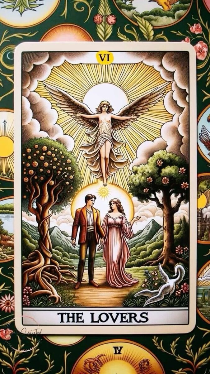 Карта Таро Влюбленные описывает волнующий момент встречи с родственной душой, с тем, кого вы долго искали, может быть, всю свою жизнь. Вместе с этим необходимо не забывать про ответственность за будущее этого чувства, ведь то, как вы сможете сохранить пламя любви, зависит не столько от обстоятельств, сколько от вас самих! Аллегория шестого Аркана Таро — союз противоположностей — изображается в виде мужчины и женщины. Это символ любви, дружбы, крепкой и искренней связи, особенно если между людьми есть барьер, который эти двое должны преодолеть, чтобы соединиться. В некоторых колодах таро, например Санта Муэрте, значение карты наводит нас на мысль о том, что соединение двух людей в пару возможно лишь при условии ТРЕТЬЕГО фактора (ребенок, общее жилье, внешние обстоятельства и т.д) как будто бы паре не хватает чего-то для полного совместного счастья. Общее значение и толкование карты Таро «ВЛЮБЛЕННЫЕ» в раскладах Прямое положение карты Карта Влюбленные всегда означает решение, выб