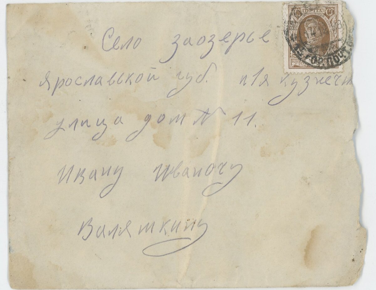 Проходят десятилетия, меняются эпохи, но кое-что остается неизменным для простых людей: жизнь в Москве не сахар, если нет работы Перед нами редкость — конверт, на котором указан адрес получателя. Даже сегодня, если пишут в деревню или в село, то обычно хватает имени и фамилии, а в прежние времена и подавно адресов не писали. Но тут — исключение. Отправлено 14 декабря 1928 года Ивану Ивановичу Валяшкину по адресу: село Заозерье Ярославской губернии, улица 1-я Кузнечная, дом 11. Радостно бежим смотреть карту — а там как-то странно: Дом 11 пропал! Очевидно, в какой-то момент нумерацию домов привели к стандарту: четная-нечетная стороны. И нечетные номера просто пропали. Ладно, с этим мы еще разберемся. Что же у нас в конверте? А в конверте сразу два письма от молодой девушки Сони Валяшкиной: деловое родителям и романтическое — сестре. Сегодня почитаем первое. Соня благодарит папу за «бумагу», но пишет, что эта бумага не помогла ей устроиться на биржу. Имеется в виду документ — справка, нео