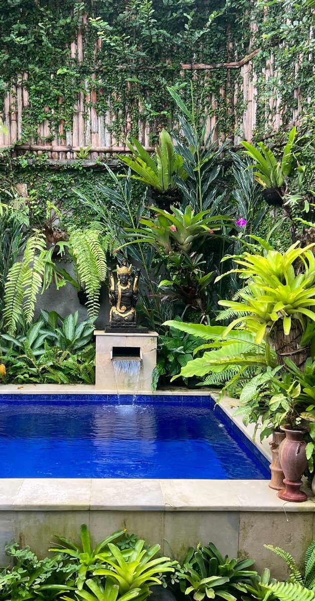 Расположена в уютной деревне, за пределами центра города Спроектирована в традиционном балийском стиле с использованием натуральных материалов, самобытного декора, светлых стен. Две просторные спальни с высокими потолками и стеклянными панорамными окнами для проникновения естественного света. Спальни с собственными душевыми комнатами. Затененный внутренний дворик с открытой кухней и гостиной зоной. Вызывающий вначале некоторое недоумение вопрос, который мне часто задавали агентства при поиске виллы: открытая кухонная зона или закрытая, стал мне понятен теперь. Конечно - открытая, наполненная звуками природы. Будучи далеко не искусным кулинаром, но, на этой очаровательной кухне блюда получались аппетитные и вкусные. Надолго запомнятся наши завтраки с панкейками, джемом и шоколадной пастой. Вкусное начало нового дня! Переживания по поводу фауны оказались напрасными - сильно нас не беспокоили местные представители (насекомые). Хозяева виллы - Марка и Каде, молодая пара с ребенком, живут п
