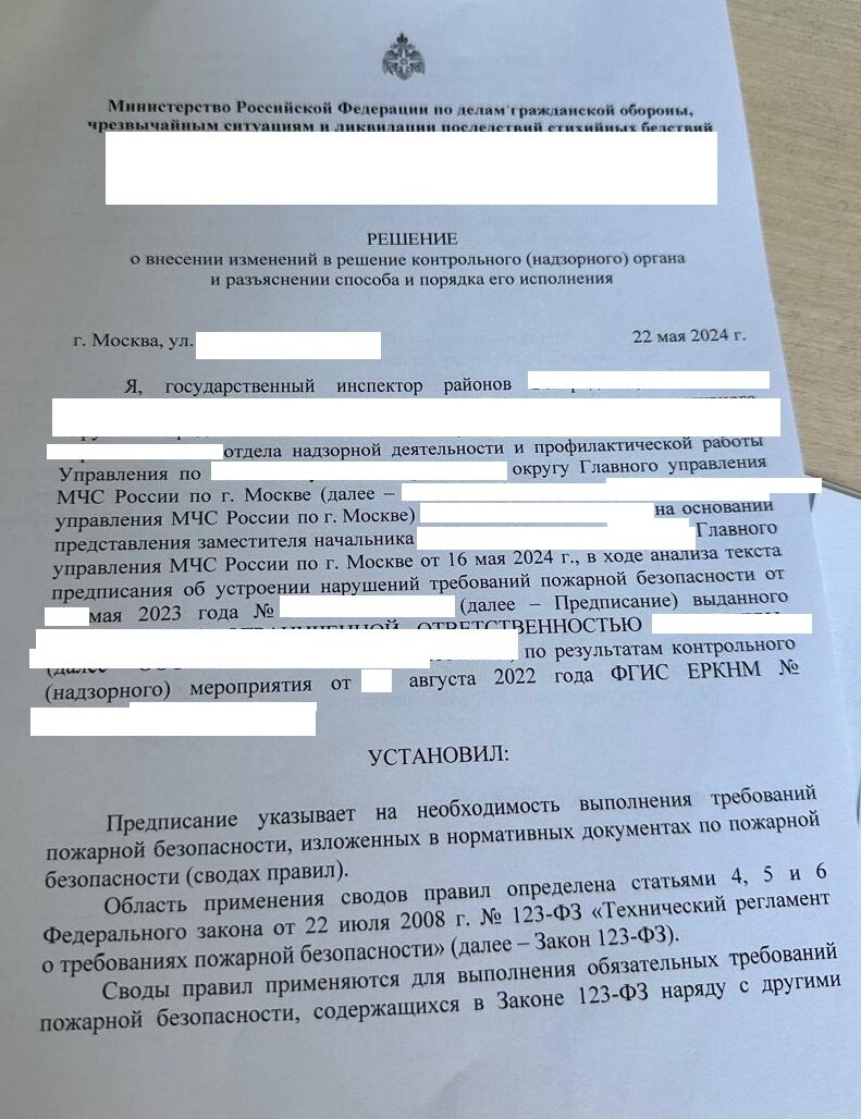 В продолжение истории о том, что представителя собственника объекта вызвали в РОНПР для подписания "обновленного" предписания. Основание - это что нет требований пожарной безопасности в предписании, и надо расшифровать его еще раз? Дописать на полях? В общем, инспектор МЧС мало того, что решил "обновить" нормативные ссылки в предписании, так еще и дописать нарушения, да так, что смысл поменялся кардинально. При этом не оформляя КНМ как это необходимо в соответствии с ФЗ от 31.07.2020 N 248-ФЗ "О государственном контроле (надзоре) и муниципальном контроле в Российской Федерации". При этом выпустив "обновление" предписания с сроком исполнения до этого "обновления". Решение от 22 мая, а предписание заканчивается в феврале. Характерный пример: П.91 того же Федерального закона от 31.07.2020 N 248-ФЗ (ред. от 25.12.2023) "О государственном контроле (надзоре) и муниципальном контроле в Российской Федерации": Статья 91. Недействительность результатов контрольного (надзорного) мероприятия 1. Ре