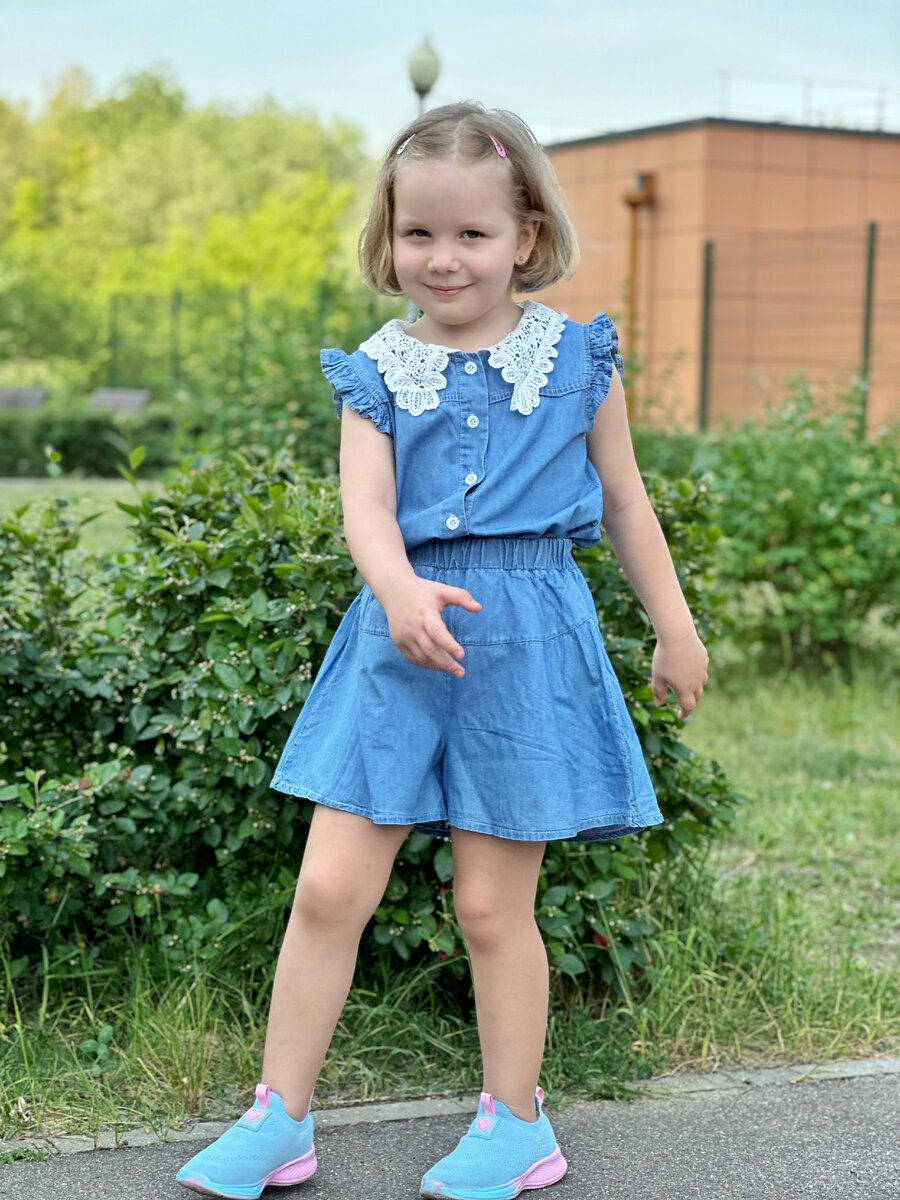Представляем подборку образов Василисы для жарких дней в городе Стильный джинсовый комплект 👚 Верхняя часть комплекта представляет собой милую джинсовую блузку с короткими рукавами и нежными рюшами на плечах. Эти рюши добавляют образу воздушности и делают его ещё более очаровательным. Но настоящей изюминкой является изысканный кружевной воротник, придающий блузке элегантность и шарм. Белое кружево красиво контрастирует с голубым оттенком джинсы, создавая нежный и романтичный образ. 👖 Шортики, выполненные из легкой джинсовой ткани, идеально дополняют блузку. Они свободного кроя, что обеспечивает свободу движений и комфорт в жаркие летние дни. Эластичный пояс делает их удобными и легко надеваемыми, а также позволяет им сидеть идеально на любой фигурке. 👟 Завершают образ яркие разноцветные кроссовки, добавляющие динамичности и веселья. Эти кроссовки не только стильные, но и удобные, что позволяет нашей маленькой моднице активно проводить время, не ощущая дискомфорта. 🌿 Такой джинсовы