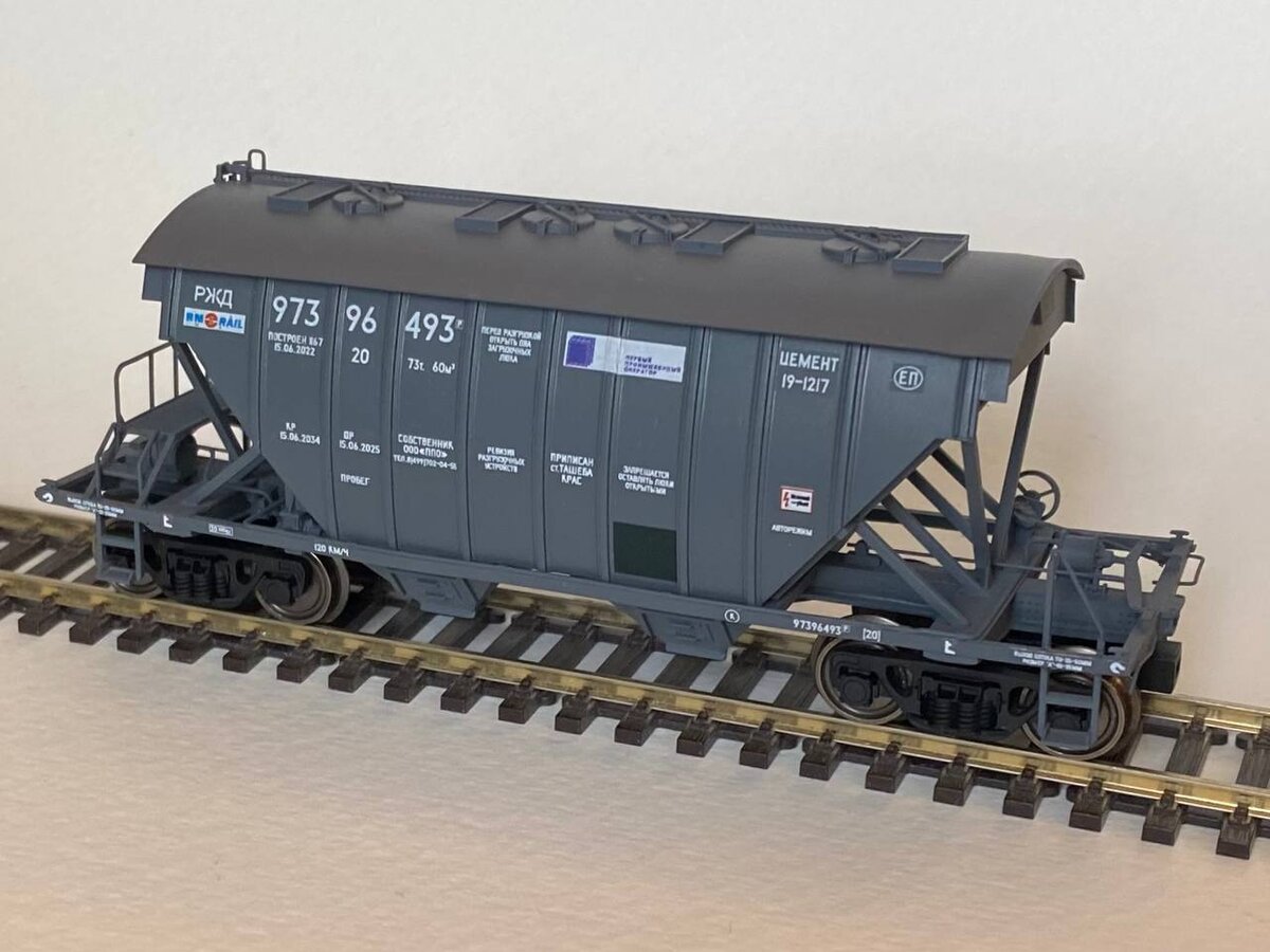 Модель хоппера-цементовоза серии 19-1217 в масштабе 1:87, построенная из набора для самостоятельной сборки производства Дмитрия Агапкина. Как и предыдущие модели этой модификации, эта строилась по фотографии реального прототипа, который принадлежит Первому промышленному оператору. Набор, изготовленный методом 3D печати, уже содержит необходимый комплект декалей и позволяет собрать модель, максимально приближенную к прототипу. Надписи подобраны очень хорошо, сама декаль отличного качества, прекрасно ложится на поверхность модели и приваривается. На фотографии прототип - и это скорее исключение, чем правило, для вагонов этой серии - запечатлен практически идеально чистым, и позволяет разглядеть все детали маркировки вагонов этой серии. Как правило после нескольких лет эксплуатации цементовозы покрываются толстым серым слоем цемента. И в ходе ТО или ремонтов в лучшем случае расчищаются основные надписи, а остальное остается покрыто пылью. Для вагонов именно этой серии эта проблема усугуб