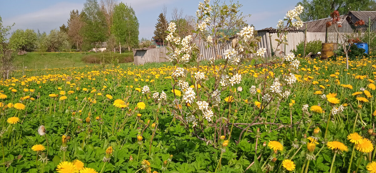 Если после 20-х чисел мая участок за сеткой выглядел так то уже в конце мая мы наблюдали такую картину на даче Даже смотреть страшно на это "великолепие"! Как назло старая бензокоса сломалась и мужу никак не удается ее починить. Какой-то резиновый колпачок нужно срочно приобретать Муж пытался покосить обычной крестьянской косой, но очень быстро устал и бросил это занятие. Косить травищу он ненавидит, друзья мои, как и сельскую жизнь... Все свободное время предпочитает проводить в городе, в отличии от меня Так вот! На участок с одуванчиками смотрит с ненавистью и пока никаких действий не предпринимает, словно его не касается Тянуть время можно сколько угодно, но траву косить все равно придется... Одна местная жительница нашего поселения в прошлом году пришла с косой и выкосила весь наш участок. Всю траву запихала в мешки и вывезла для своей коровы. Ах, как мы были рады!!! Я сказала ей, чтобы на нас даже внимание не обращала и косила траву сколько надо весь сезон В этом сезоне мы встрети
