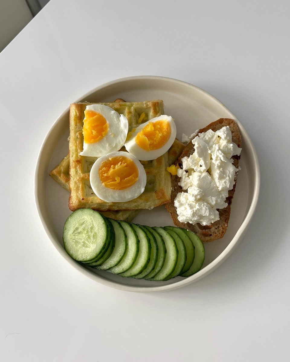 Кабачковые вафли-оладушки с яйцом, льняным хлебом, сыром фета, свежим огурцом и смесью семян ✨ Рецепт вафель-оладушек: • Кабачок - 1 шт. (~200 гр., на терке, отжать от лишней воды) • Яйцо - 1 шт. • Мука пшеничная - 1 ст.л. (без горки) • Мука рисовая - 1 ст.л. (без горки) • Соль, перец по вкусу • Масло оливковое - 1 ст.л. Время приготовления: 15-20 минут при 180 градусов. Готовые вафли должны быть румяными.