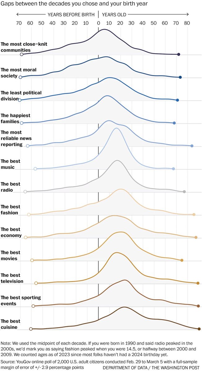 Оценка того, когда жилось лучше, зависит исключительно от возраста Перед вами результат замечательного теста, превратившего интуитивную мудрость в обоснованное на фактах заключение. · Про то, что жизнь была лучше, когда деревья были большими, известно давно. · Но то, что из этого следует невозможность общественного консенсуса по вопросу о лучшем десятилетии в жизни страны, - было неочевидно. Даже не верится, но пик положительного восприятия большинства аспектов культурной, экономической и социальной жизни приходится на подростковый и юношеский возраст: музыка, кино, новости, отношения в семье и с друзьями … - все что угодно. Еще более удивительно, что ностальгическое восприятие характерных черт времен собственной юности одинаково для всех поколений (т.е. не зависит от того, когда вы родились). Это подтверждается результатами весьма солидного опроса 2 тыс американцев, проведенного YouGov. Подавляющее большинство, в независимости от пола, расы, доходов, региона и т.д., ответили