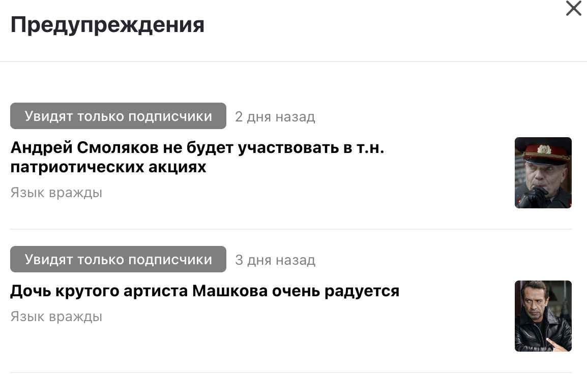 Прямо подряд два материала Дзен ограничил с одним и тем же диагнозом: ЯЗЫК ВРАЖДЫ: Перечитал один по диагонали: Потом другой: Подскажите, пожалуйста, где там этот самый ЯЗЫК? Я явно чего-то не догоняю. Правда, комменты там жестковатые встречаются, действительно: А что там по нашим 18 думцам, имеющим двойное гражданство , недвижимость и семьи за границей!? По нашим чиновникам высшего ранга, имнющих те же проблемы! Про патриотичных и преданнейших стране олигархов , вообще говорить не стоит! А уж лицедеев, продающих и предающих честь и достоинство ради куска ,,хлеба с маслом,, , и вспоминать то не стоит! ****** Всв вопросы к детскому психологу: у Маши есть мама, она русофобка в квадрате, и какие претензии к папа?'. Мавр сделал свое дело .. А Маша, подражая маман стремится её переплюнуть в русофобии ещё и из женской солидарности, чтоб побольней обидеть папа'. Пусть её детские комплексы останутся при ней, при чем здесь Россия. А мужикам, как говорил Жеглов, нужно вовремя со своими бабами ра