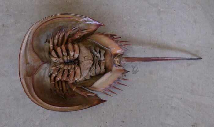 А еще у него голубая кровь, которая очень ценится в медицине. Знакомьтесь, это Мечехвост. Он относится к отряду Членистоногие, из класса Меростомовые. Мечехвост получил своё название из-за длинного хвоста похожего на меч. К мечехвостам относится более 70 ископаемых и 4 современных вида. Его ареал обитания достаточно обширен. Он встречается в России на Дальнем Востоке, в водах Азии и в Атлантическом океане рядом с Северной Америкой. Считается что предки мечехвоста жили более 400 миллионов лет назад, а значит они застали времена динозавров. Но несмотря на это, мечехвосты не сильно изменились за эти миллионы лет. Видимо природа сразу сделала их идеальными. Для места жизни, мечехвост выбирает глубину от 10 до 40 метров. Большую часть жизни проводит на дне и является санитаром морской фауны, так как питается останками рыб и животных. Помимо этого, мечехвост питается моллюсками, морскими червями, а иногда водорослями. В период размножения, самцы и самки выходят на песчаные пляжи, в приливно-