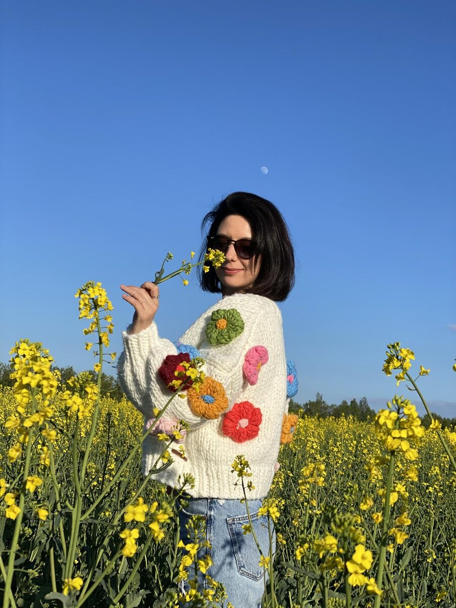 Приглашаем вас на мастер-класс по вязанию объёмных цветов. Ими можно украсить одежду, сумочку, резинку для волос, ободок, шторы или всё, что душе угодно! В этом материале показываем, как сделать свитер стильным и оригинальным с помощью такого декора. Прежде чем приступать к вязанию, посмотрите видео, а затем прочитайте инструкцию. Этап 1 Возьмите пряжу для цветка, мы использовали эту. Свяжите столбик из 6 воздушных петель. Введите крючок в первую петлю и протяните сквозь неё рабочую нить. У вас должен получиться кружок. Этап 2 Провяжите 2 воздушные петли подъёма, в кольцо провяжите столбик без накида. Чередуйте 6 раз. Соединительным столбиком завершите круг. Введите крючок в первую арку из двух воздушных петель, захватите рабочую нить и протяните. Провяжите 4 воздушные петли. Этап 3 Теперь свяжите объёмные столбики. Важно, чтобы нить лежала под рукой свободно, без натяга. Сделайте накид, введите крючок под воздушные петли и вытяните петлю на длину четырёх воздушных петель. Сделайте 8 н