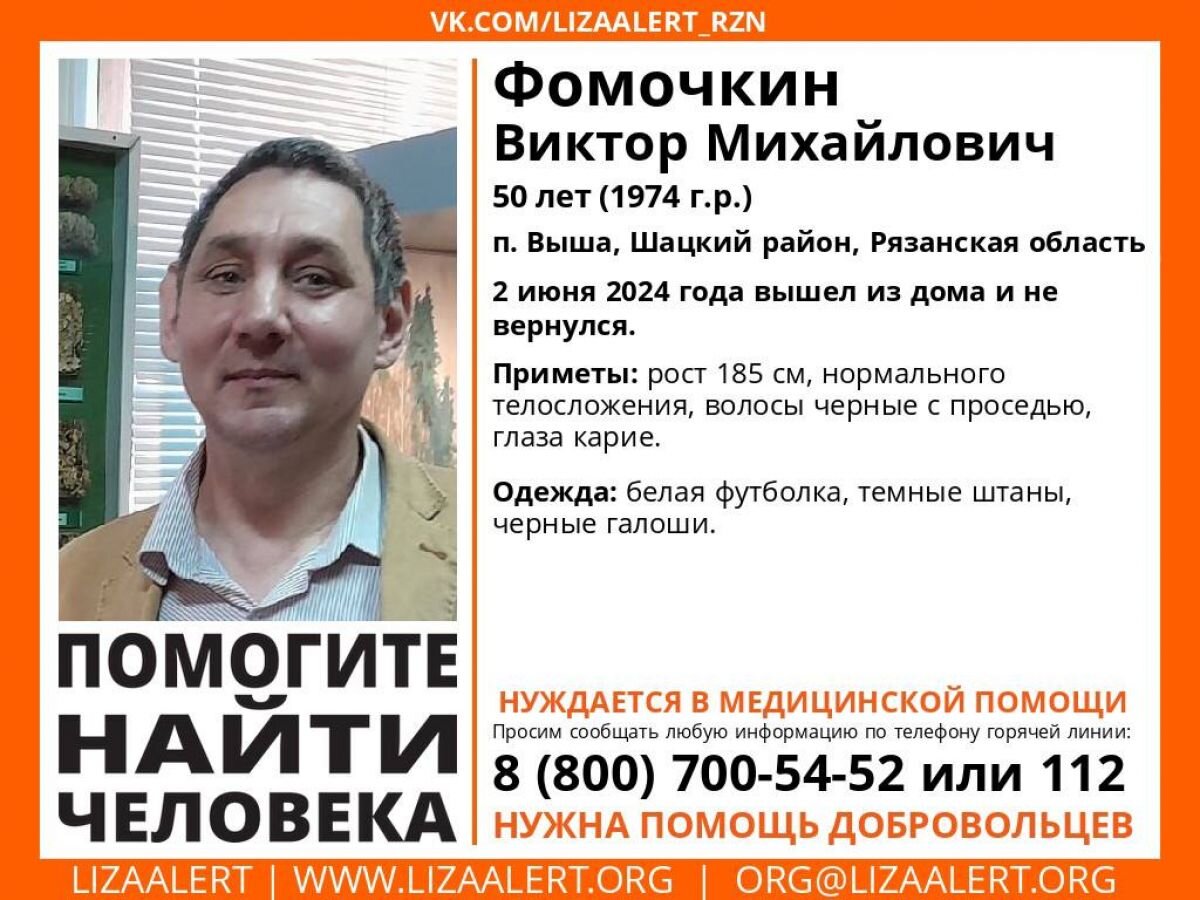 Волонтеры объявили поиски пропавшего в поселке Вышка Шацкого района Рязанской области 50-летнего Виктора Фомичкина. Об этом сообщается в группе поисково-спасательного отряда «ЛизаАлерт». 2 июня мужчина вышел их дома и с тех пор его местонахождение неизвестно. Пропавший ростом 185 см, нормального телосложения. У него черные волосы с проседью и карие глаза. В день исчезновения мужчина был одет в белую футболку, темные штаны и черные галоши. Отмечается, что Виктор Михайлович нуждается в медицинской помощи. Тех, кто обладает какой-либо информаций о местонахождении мужчины просят сообщить по телефонам: 8 (800)700-54-52 или 112. Для поисков требуются добровольцы.