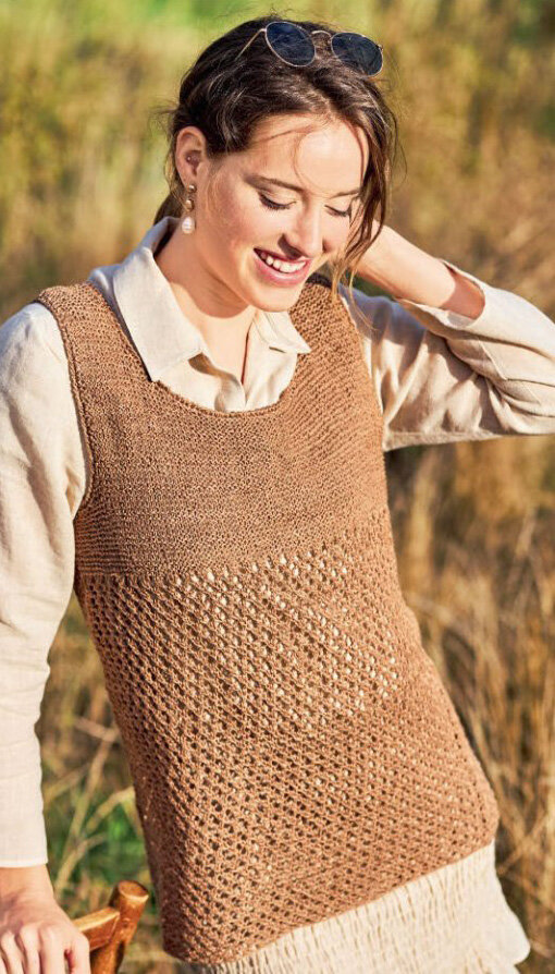 Эту льняную модель с сетчатым узором можно носить и как жилет, и как топ. Кокетка, выполненная платочной вязкой, обеспечивает надежную защиту от нескромных взглядов.