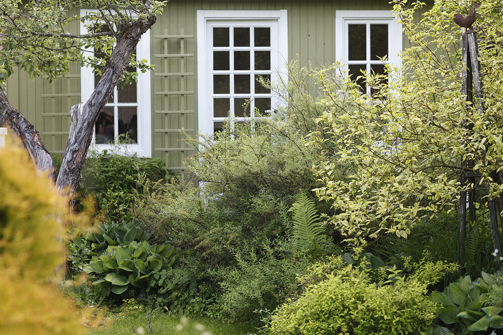 Дорожка к домику справа заросла аквилегией и геранью. прекрасная мешанина! В ней виден рододендрон, еще маленький, но все впереди! И конечно же, страусник! Он в сочетании с хостами главное украшение этого цветника. В палисаднике огромная голубая хоста отлично сочетается с золотистым молочаем. А амурский виноград так пока и не проснулся. Там же цветут аквилегии и хохлатка. Завтра - про горку и площадку за домом!