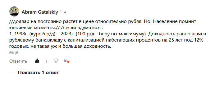 Но не буду говорить о том, что доллар не надо покупать никогда. То о чем я написала выше - это исторические данные, но они никогда не повторятся. Да, в прошлой жизни доллар вроде как дорожал, а по факту инвестировать в него было интересно только в определенные моменты. Те же кто систематически покупал доллары на протяжении длительного времени скорее всего проиграли даже инфляции. Но в будущем все может быть совсем по-другому. Именно поэтому, полезно иметь какой-то объем валюты в инвестиционном портфеле для диверсификации рисков. А еще лучше вложить ее в какой-то российский актив, чья доходность привязана в валюте, например, в замещающую облигацию.