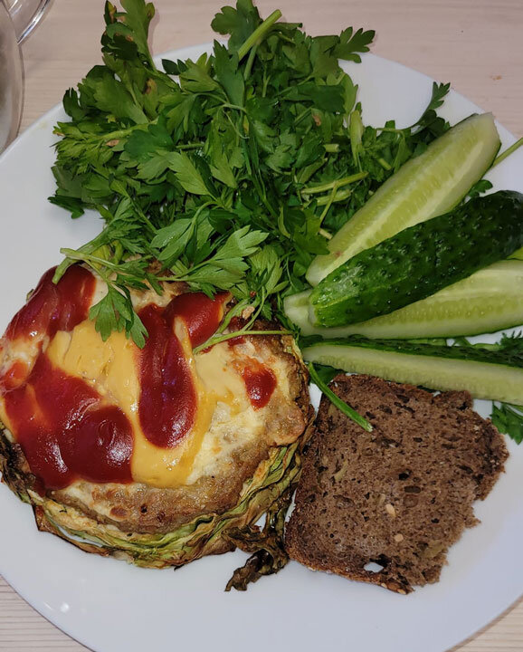 ✔ Капуста белокочанная – 1000 г; ✔ Фарш мясной с луком– 400 г; ✔ Масло растительное – 50 г; ✔ Сметана – 300 г; ✔ Соус томатный – 75 г; ✔ Соль, перец – по вкусу. Капусту нарезать на «стейки» толщиной 1,5-2 см, посолить, поперчить, смазать растительным маслом или сметаной. На стейки выложить фарш из любого мяса с луком. Обильно смазать сметаной, сверху добавить томатный соус. Запекать в разогретой до 180 градусов духовке или мультипечке. КБЖУ на 100 г – 102/4,8/7,1/5,7. На завтрак к капустному стейку у меня - кусок домашнего ржаного хлеба с семечками и оливками, огурчик и зелень. От наших друзей: Александр Лазуткин, космонавт, Герой России, на Радио Медиаметрикс Больше общения и рецептов - в группе "Рецепты для диабетиков" в ВКонтакте! Рецепт на странице Автор рецепта – Людмила Чураева © Почтенный возраст Online и Рецепты для диабетиков