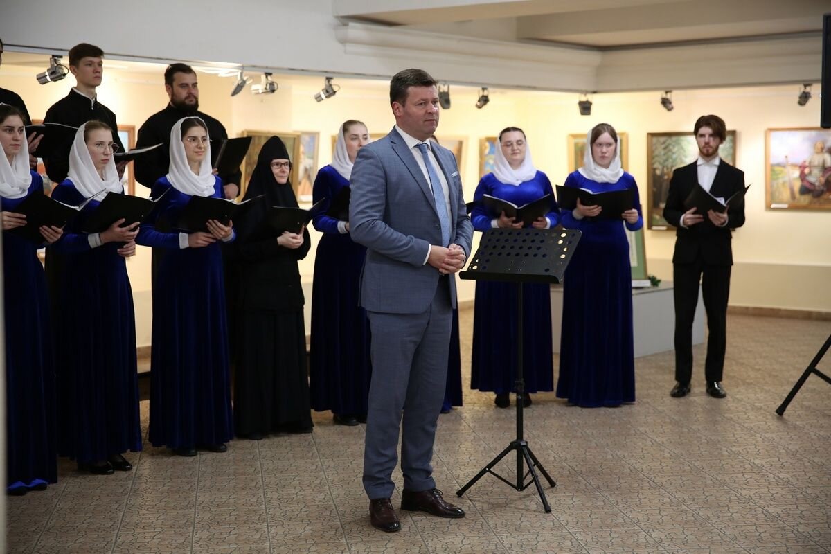 В Доме музыки были представлены более 60 работ по иконописи, живописи и композиции, выполненных студентами Духовного училища по подготовке регентов и иконописцев. В экспозиции можно увидеть копии работ из музеев Ярославля и Великого Новгорода, живописные полотна о Святой земле, новописаные и копийные иконы, портреты. Фото: Городская дума Калуги В этом году преподаватели и студенты отделения «Живопись» участвуют в конкурсе «Лики святых заступников Руси». На иконах и портретах изображены защитники Отечества: Александр Невский, Дмитрий Донской, Федор Ушаков и Александр Суворов. «Тематика выставки сегодня особенно актуальна: во все времена русские воины вставали на защиту родной земли. Благодаря им наша страна выстояла в самые тяжёлые времена. Наши бойцы, сражающиеся сегодня в зоне проведения специальной военной операции – такие же защитники Отечества, достойные славы своих героических предков. Благодарю всех художников и наставников, приложивших свои кисти и талант к созданию этих замечат