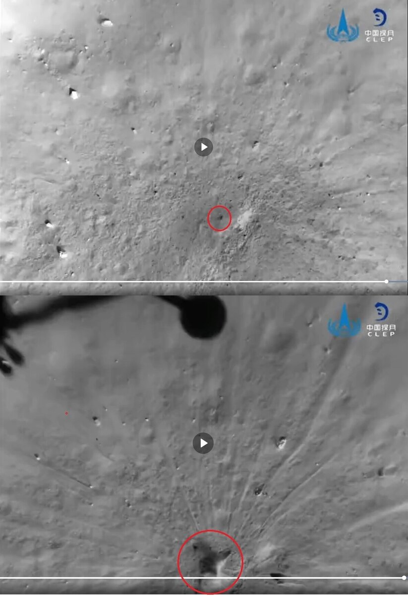 Фото - поскольку на видео это мало похоже. Сведем два ближайших фото вместе: Выберем реперные точки Проведем базовую линию, и отложим равные отрезки После воздействия реактивной струи из малого темного пятна проявилось большое неправильное пятно, с одной стороны светлое, с другой темное. "Впуклость" или выпуклость? Тени от "камней" (как показал еще советский Луноход, на Луне есть камни, а есть рыхлые образования, формой похожие на камни) для данного кадра дают направление солнечных лучей примерно справа-снизу (или в направлении с 5 часов на 10 часов) - далее показано стрелкой. Освещение и тени показывают, что это неправильной формы горка - то есть выпуклость. Почему она проявилась? а до этого была не видна? Подождем объяснение китайцев. Могу предположить, что пыль, которая была сдута, и подстилающий слой, на котором она лежала, имеют разные оптические свойства - в свое время я посвятил этому несколько подробных, развернутых статей. Ссылка на статью.