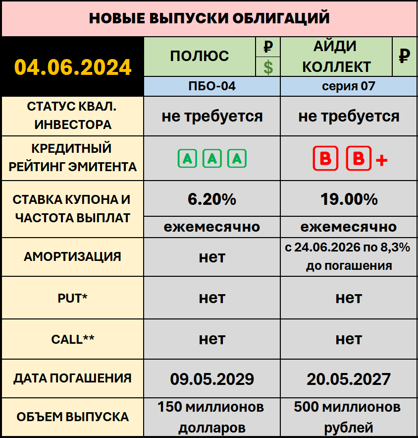 🕰 Доброе утро, дорогие читатели! Сперва хочу обратиться к своему портфелю - уважаемый портфель, не надо сегодня снова терять 0,3%, я уже понял, что ты так умеешь и верю в твои таланты. Пора расти! А теперь можно и о новинках дня :) ✅ Золотые коллекторы сегодня начнут торги после обеда: 1️⃣ ПОЛЮС ПБО-04 (🅰️🅰️🅰️) 🔢 Тикер: $RU000A108L81 🔸 Номинал бумаги - 100$, расчеты в рублях 🔸 Выпуск без оферт и досрочного погашения Караван бумаг с привязкой к зеленой заморской валюте набирает ход - сегодня до нас добрался второй экипаж. Выпуск, к слову, получился самым сдержанным из всей четверки братьев - купон в нем минимален. А вот пятилетний срок обращения бумаг пойдет на руку тем, кто обращается на "ты" с льготой на долгосрочное владение - как-нибудь расскажу про этот хитрый момент, позволяющий увеличить свою прибыль на бирже. Не думаю, что бумага интересна по номинальной цене с учетом текущих настроений, но и батискаф для глубоких погружений здесь тоже не нужен - ловите где-то вблизи
