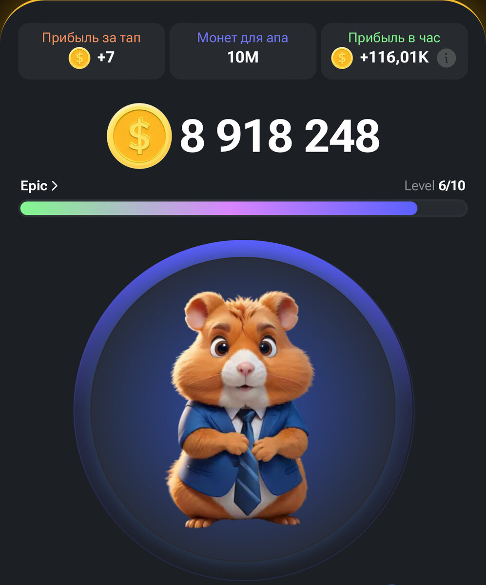 Если вы все еще думаете, заходить ли в игру - то зря. Я тоже думал пару недель. Размышлял, ну куда там хомяку до NOT. Но вижу, что у Hamster есть все шансы переплюнуть проект NOT. Короче не наступайте на мои грабли. Это потерянные миллионы в игре. Залетайте в игру как можно скорее. Я за 1 день уже успел дойти до Epic уровня. И вот вам подобная инструкция как на начальном уровне прокачать своего хомяка: 1) Для начала в игру нужно зайти. По этой ссылке - вас сразу же насыпят 5000 или 25000 момент, на которые можно сразу прокачать свой уровень. 2) Вы зашли в приложение. С чего начать? Самый важный параметр "прибыль в час". Нажав на него вы попадаете в мир разных карточек которые можно последовательно раскачивать по уровням. Там 4 раздела Markets PR&Team Legal и Specials. 3) Качать надо все. Но. Если вы посмотрите, у одних карточек прибыль десятки-сотни монет, а у некоторых тысячи, а то и несколько. Выгоднее всего качать те, что приносят больше прибыли. 5) Последний раздел, котор