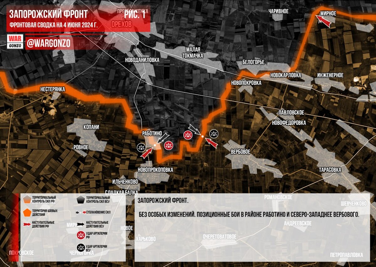 Запорожский фронт. Без особых изменений. Позиционные бои в районе Работино и северо-западнее Вербового.(Рис. 1)
