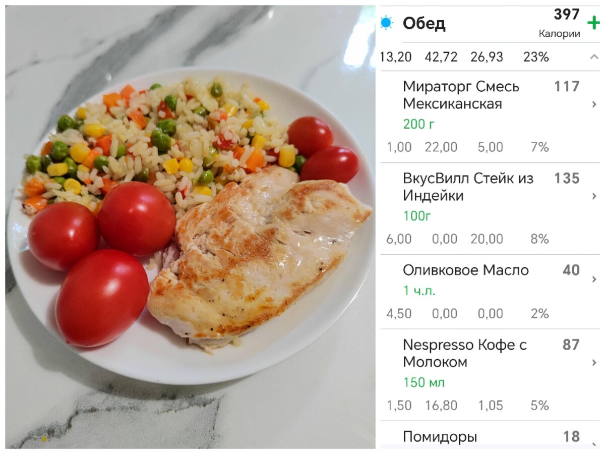 Сегодня на обед мексиканская смесь Мираторг 200 гр, стейк из индейки 100г, помидоры 100 гр, шоколад 8 гр.