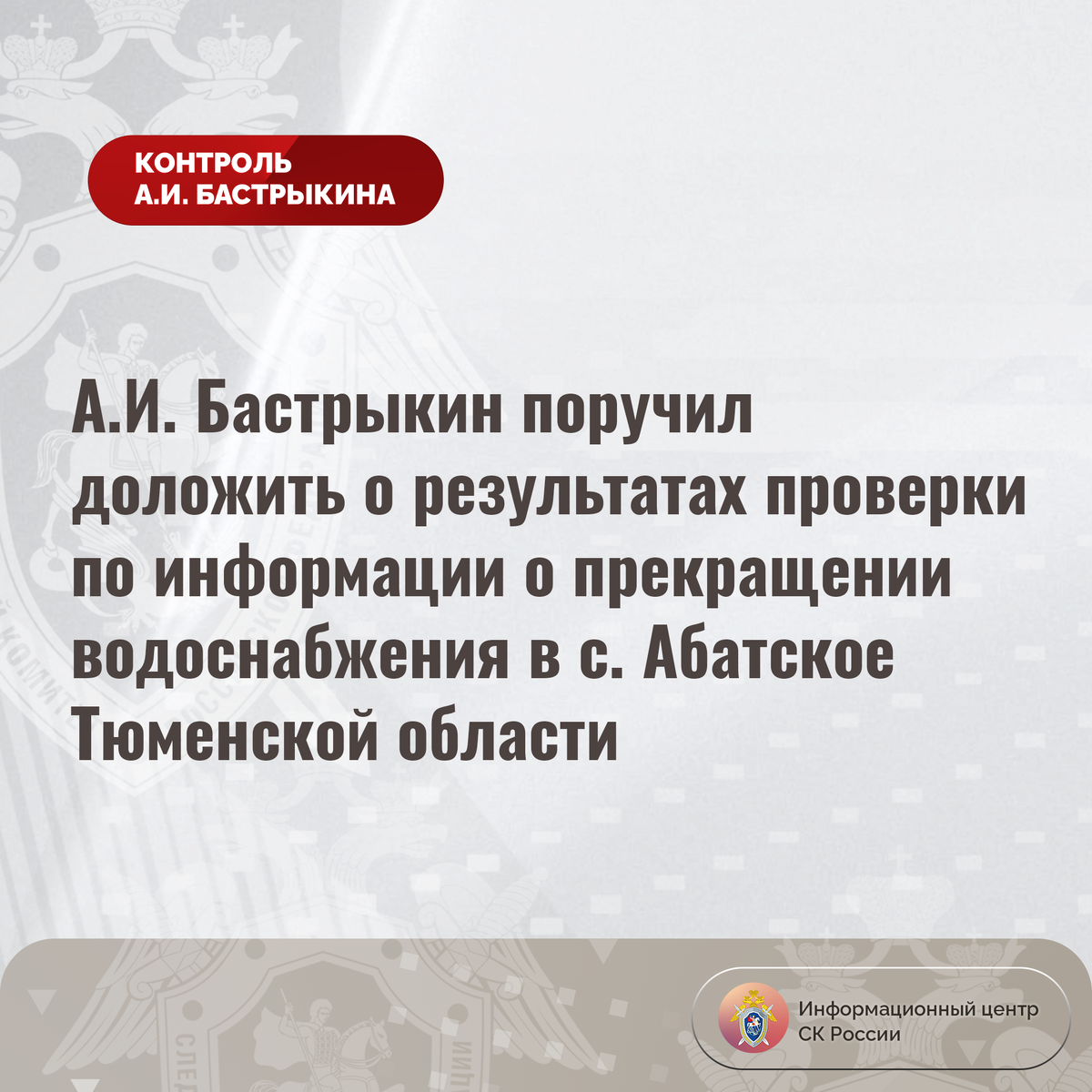 А.И. Бастрыкин поручил доложить о результатах проверки по информации о прекращении водоснабжения в с. Абатское Тюменской области