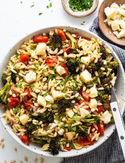 Этот яркий и ароматный салат в средиземноморском стиле станет идеальным гарниром к любому летнему барбекю. Он также является отличным обедом сам по себе или подается вместе с жареной курицей или рыбой. Для заправки: 1. Доведите до кипения большую кастрюлю с подсоленной водой. Добавьте орзо и готовьте до состояния аль денте, около 5–7 минут или как указано на упаковке. Процедите и отставьте остывать. 2. Разогрейте духовку до 200 С. Равномерно распределите брокколи, лук и чеснок на противне. Добавьте оливковое масло и соль и перемешайте. Запекайте овощи 15 минут. 3. Через 15 минут добавьте на противень помидоры и запекайте еще 10–15 минут или пока брокколи не начнет подрумяниваться. Достаньте из духовки и оставьте остывать на 15 минут. 4. Пока овощи запекаются, нагрейте небольшую сковороду на среднем огне и поджарьте кедровые орехи до золотистого цвета, примерно 3–5 минут. 5. Приготовьте заправку. Добавьте в миску лимонный сок, цедру лимона, оливковое масло, хумус, соль и перец и перемеш