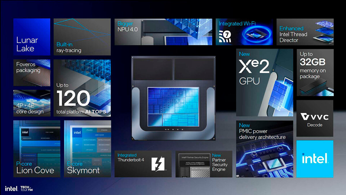 С технической точки зрения Lunar Lake устроены с выдумкой. Процессоры создавались с акцентом на энергоэффективность. Intel переработала концепцию многочиповой компоновки. Теперь кристаллов только 2, зато добавились микросхемы памяти LPDDR5X (до 32 ГБ) прямо на одном текстолите с основными блоками. Вычислительный кристалл выполнен на 3-нм техпроцессу TSMC, кристалл с логикой по 6-нм на мощностях того же производителя, а сборкой Intel занимается самостоятельно.