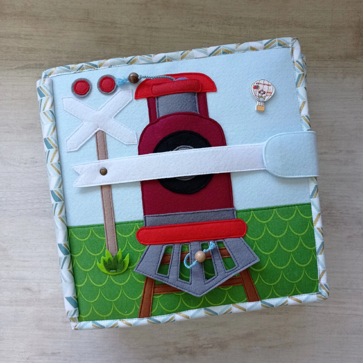 Я вас, наверное, уже утомила своими книжками. Но мне осталось рассказать только об одной. Эту книгу я шила на день рождения племянника. Идею увидела в интернете, купила выкройку, но всё равно добавила свои элементы. По размерам это самая большая книга, что я шила. На обложке - паровоз, у которого может идти дым из трубы. Чтобы открыть книгу, нужно сначала открыть шлагбаум. На первой страничке - автомобиль. Племянник - любитель техники, поэтому и книга полностью посвящена машинам. Под капотом автомобиля прячутся разные элементы на кнопках, резинках и липучках. Можно посидеть за рулём авто. Руль крутится, если на него нажать - раздастся гудок. Рядом - показатель уровня бензина - он может меняться, если потянуть за шнурок. Есть также двигающийся рычаг переключения передач. Следующий разворот - гараж. Внутри которого хранятся разные инструменты. Поле внутри гаража сделано из велкро: здесь можно собирать пазлы на липучке. В гараже можно провести полную диагностику авто: поменять колеса, п