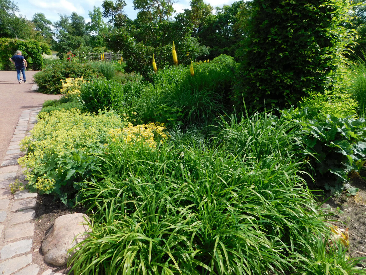 После розария я заглянула в сад многолетников по соседству. Времени у меня было мало, так что пробежалась я быстро и сделала пару фото, без поиска табличек с названиями. Понравилась живописность ландшафтов и сочная зелень. Цветут золотые свечи эремуросов и манжетка. Есть очень симпатичный уголок с прямоугольным прудом с нимфеями, в окружении японских кленов. Цветет зопник: А в такой беседке приятно передохнуть в жару: Пионы и ирисы отцвели, так что в последний день мая здесь преобладает желтый цвет. Хотелось порадовать вас летними красками. Всем хорошего настроения и отличной погоды!