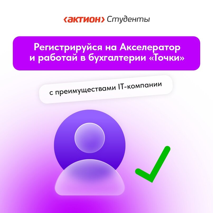Участвуй в Акселераторе от Точка-банка и получи шанс поработать в крупной IT-компании с собственным банком. Познакомишься с бухгалтерией будущего и сможешь еще раз влюбиться в эту интересную профессию. Круто, хочу участвовать! Тогда проверяй, подходит ли тебе Акселератор. Если ты: Все совпало? Значит звезды на твоей стороне и можно участвовать :) А что будет на Акселераторе? Несколько этапов в онлайн-формате – сможешь прокачать свои hard- и soft-скиллы, пообщаться с экспертами и узнать много нового о профессии. Если успешно выполнишь все задания, получишь заветный оффер – приглашение на работу в команду Бухгалтерия «Точка-банка». Расскажите подробнее о работе… После получения оффера ты пройдешь очное обучение в компании. Затем будешь заниматься поддержкой клиентов, а также дистанционно решать вопросы бизнеса. Это не традиционная бухгалтерия с кучей бумаг и рутинными задачами, а работа со всеми преимуществами IT-сферы. Начнешь карьеру в топовой компании и станешь мультифункциональным сп