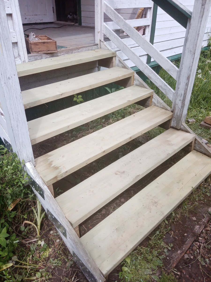 Вчера муж с сыном целый день делали новые ступеньки к дачному дому. Старые совсем развалились, так как состояли из двух досок, и со временем они разошлись и некоторые сломались. Несколько часов ступенек не было совсем, собака отважно прыгала, а я вспоминая детство, кряхтя забиралась на крыльцо с табуретки.