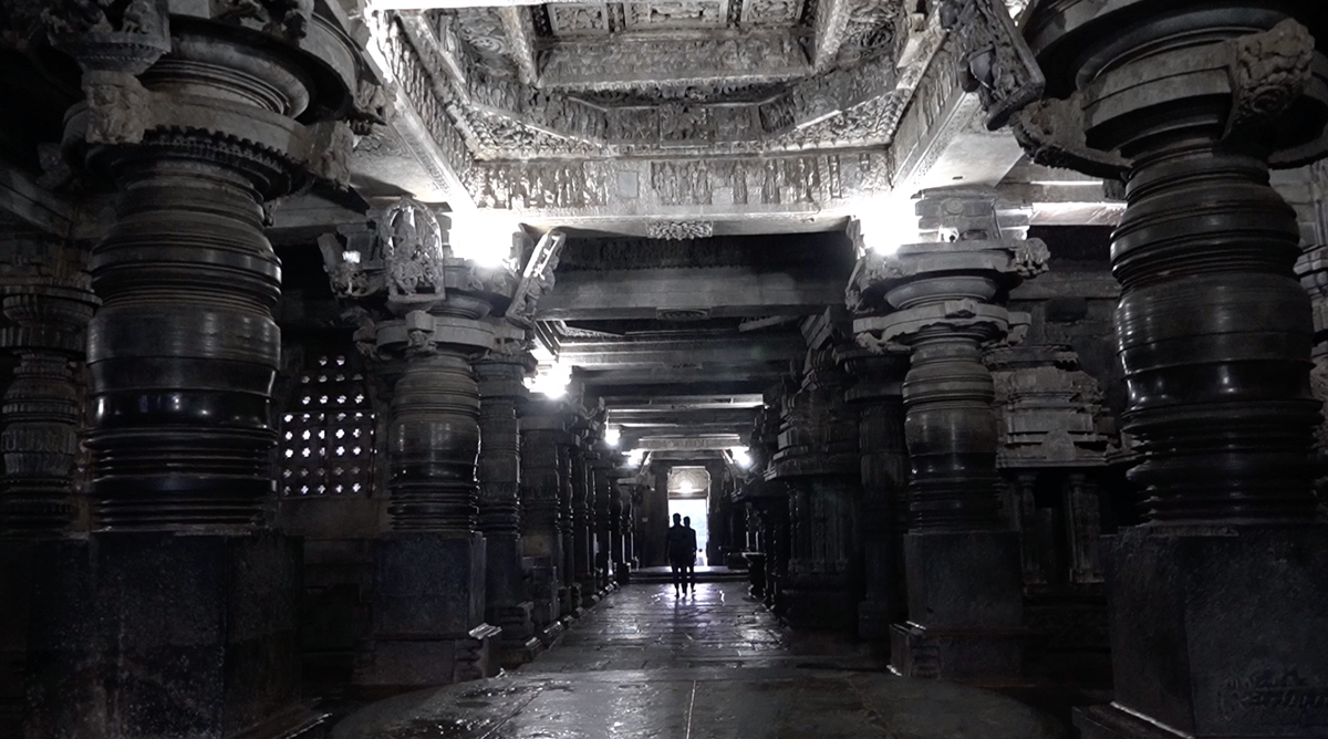 Тем не менее, нам удалось тайком запечатлеть его на камеру – как снаружи, так и внутри. Как и в других храмах хойсальской архитектуры, в качестве строительного материала был использован талькохролит, известный как мыльный камень. Это очень мягкий материал, легко поддающийся обработке. Чего не скажешь о колоннах, поддерживающих потолок внутри здания, и скульптур, изображающих древних богов.