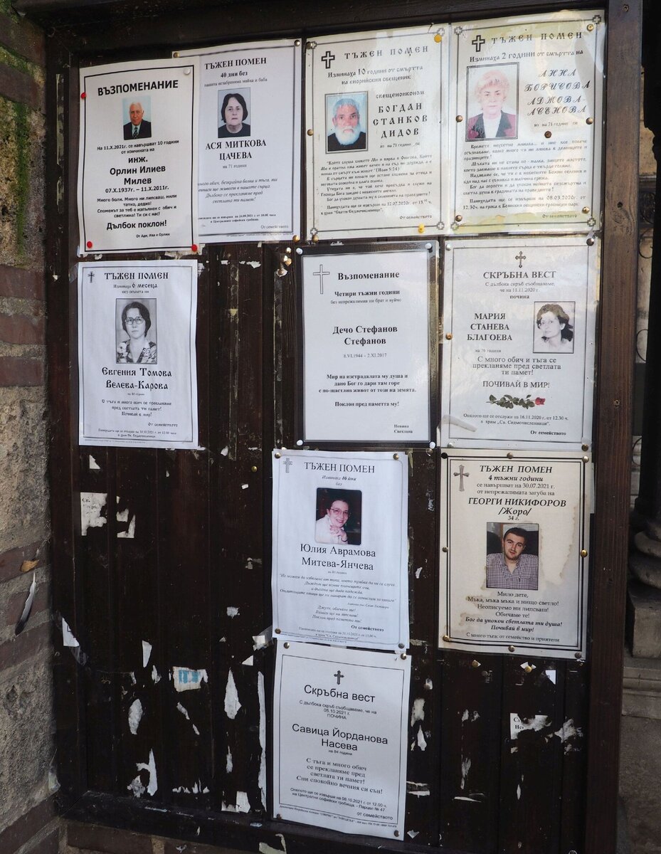 Пожалуй, такого количества уличных некрологов, как в Болгарии, нет ни в одной другой стране на Балканах. Здесь же они висят буквально повсеместно: на стенах зданий, на столбах и на заборах, на информационных стендах и электрических будках... Проще сказать, где их не висит. Если это частный дом с оградой в небольшой деревушке, то пара-тройка некрологов обязательно будут висеть на калитке. Ну, а если речь о подъезде многоквартирного дома, то кажется, на нем попросту не может висеть меньше десятка некрологов.