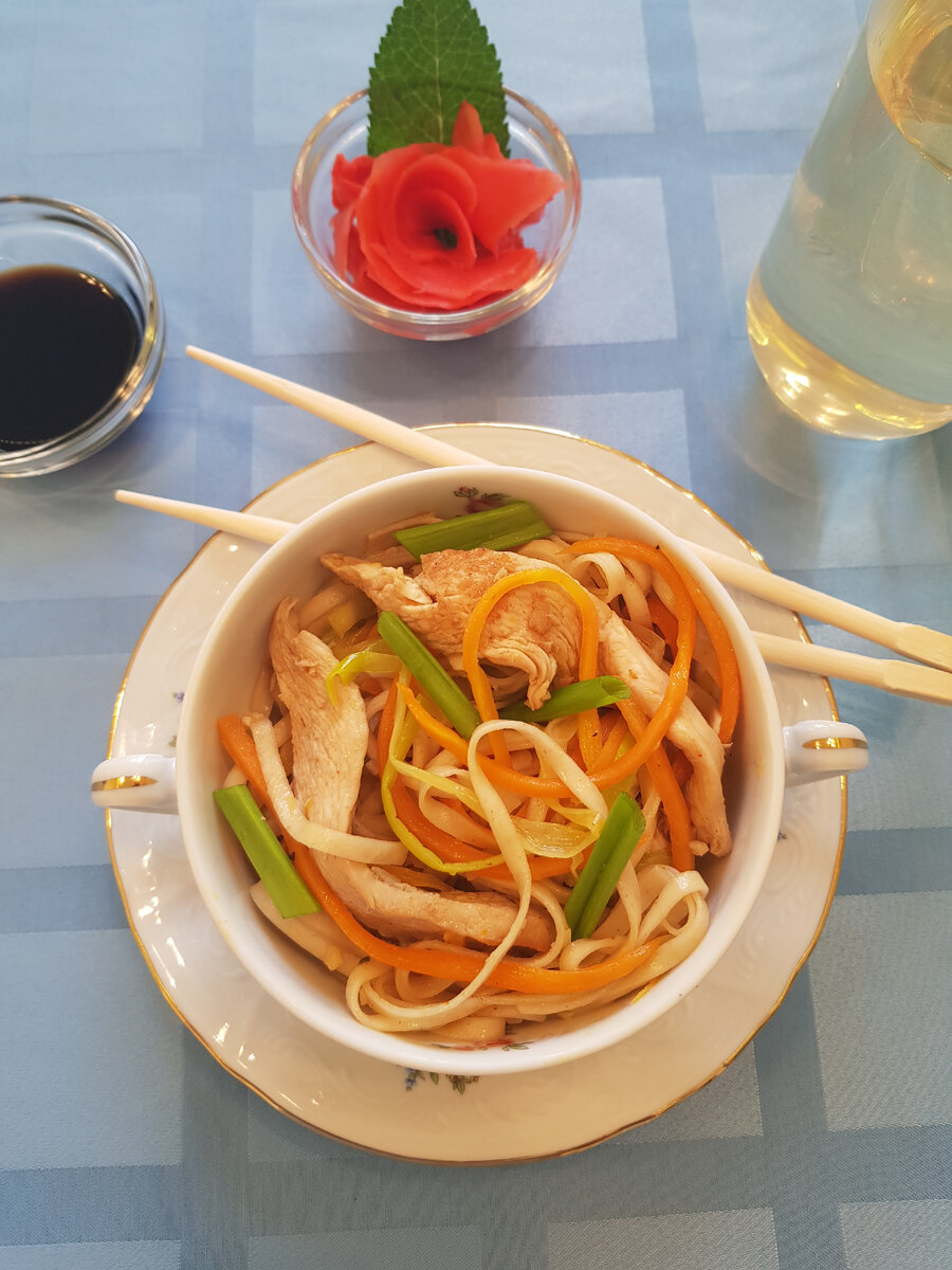 Добрый день, дорогие друзья! Сегодня я предлагаю очень быстрое блюдо из японской лапши «4 злака», на варку требуется всего 3 минуты, а дополним мы ее филе куриной грудки, которое тоже требует минимальной термической обработки. Для приготовления нам понадобятся: лапша 4 злака 200 грамм, филе куриной грудки 400 грамм, 1 морковка, 1 лук-порей, 3 зубчика чеснока, небольшой кусочек имбиря, 1/4 чайной ложки соли, 2 столовые ложки соевого соуса, 2 столовые ложки подсолнечного масла, 2 веточки зеленого лука, маринованный имбирь и мята. Приготовление: куриное филе нарезать полосками, почистить и измельчить имбирь и чеснок. Филе замариновать в течение 15 минут в соевом соусе, имбире и чесноке. Нарезать длинной соломкой морковь и стебель лука-порея. В хорошо разогретую кастрюлю налить растительное масло и обжарить морковь и лук до мягкости. Вынуть овощи из кастрюли, хорошо ее разогреть и обжарить на растительном масле куриное мясо. Вынуть из кастрюли мясо и сложить в емкость к овощам. В кастрюл