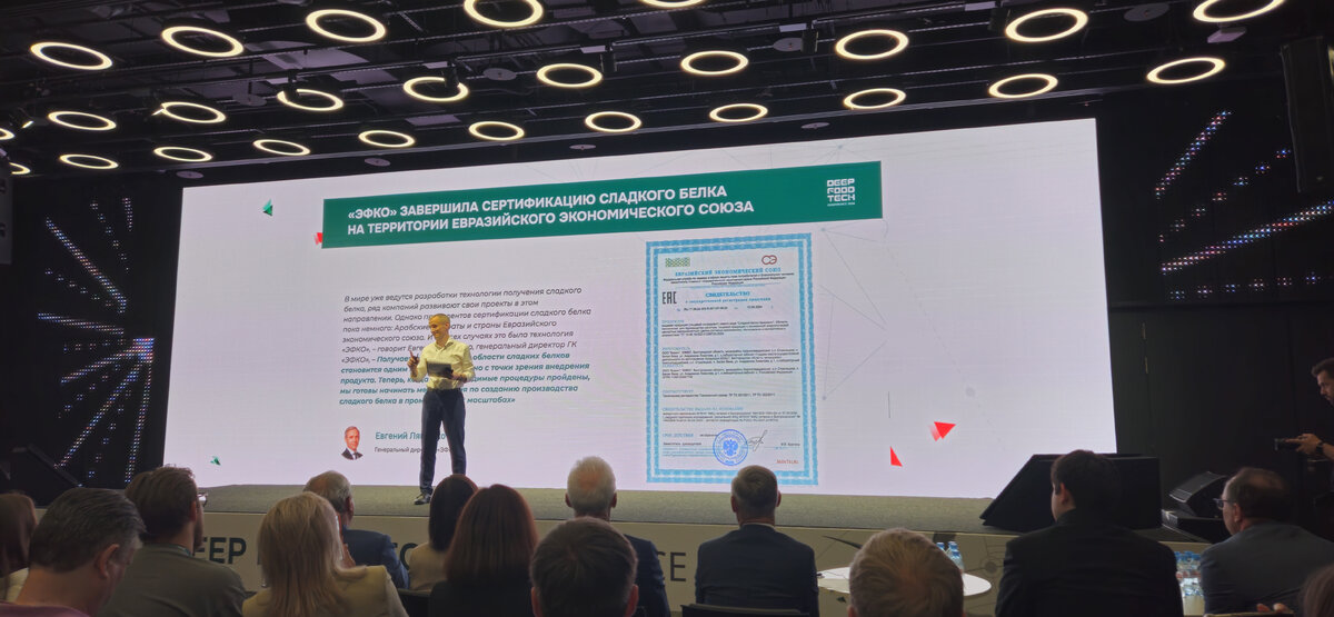 Компания «Эфко» завершила сертификацию сладкого белка на территории Евразийского экономического союза. Об этом было объявлено в ходе конференции Deep Food Tech. Источник: «Эфко» Сладкий белок браззеин получил свидетельство о государственной регистрации и теперь может использоваться при производстве продуктов питания. В условиях роста заболеваемости ожирением и диабетом ключевой задачей становится поиск альтернативы сахару, позволяющей снижать количество потребляемых калорий, контролировать уровень сахара в крови и повышать качество жизни людей. Существует ряд подсластителей и сахарозаменителей — как природных, так и химических — но все они являются компромиссными, поскольку или оказывают негативное влияние на здоровье, или дорогие в производстве. В качестве наиболее перспективной альтернативы на текущий момент рассматривается новый пищевой ингредиент — биотехнологически произведенный сладкий белок. Он в несколько тысяч раз слаще сахарозы и не повышает уровень глюкозы в крови. Разработк