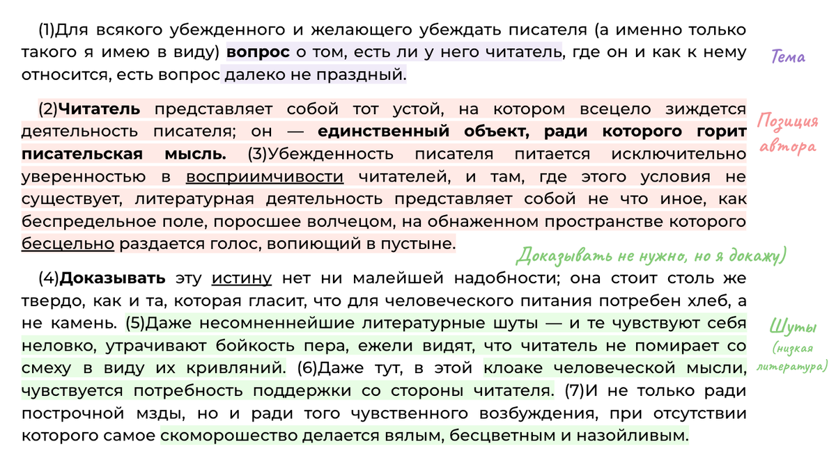 Ещё один реальный текст с экзамена — снова о литературе, снова публицистика, снова достаточно трудная проблема (трудная в плане понимания и подбора аргументов выпускниками, далёкими от литературы). Давайте разбираться, что тут могло получиться. Исходный текст для для удобства копирования (1)Для всякого убежденного и желающего убеждать писателя (а именно только такого я имею в виду) вопрос о том, есть ли у него читатель, где он и как к нему относится, есть вопрос далеко не праздный. (2)Читатель представляет собой тот устой, на котором всецело зиждется деятельность писателя; он — единственный объект, ради которого горит писательская мысль. (3)Убежденность писателя питается исключительно уверенностью в восприимчивости читателей, и там, где этого условия не существует, литературная деятельность представляет собой не что иное, как беспредельное поле, поросшее волчецом, на обнаженном пространстве которого бесцельно раздается голос, вопиющий в пустыне. (4)Доказывать эту истину нет ни малейше