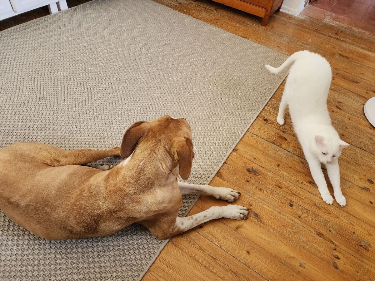 Чтобы Зойка не сидела на солнце в ожидании меня, я стала приглашать её домой. Так она могла быть какое время рядом со мной, а не получать тепловой удар. И вот самое главное... А как коты отнеслись к собаке? Если вы ещё не в курсе о чём речь, вот первая часть - ссылка. А вот продолжение Страшила Подозрительно сразу вышел к собаке. Первые два дня близко не подходил, но наблюдал издали. Чуть позже уже бежал встречать, нюхать и демонстративно шёл к ведру с едой, чтобы показать, что он тут главный, его кормят из персонального ведра и весь дом его. Пришлось этого царя кормить при собаке почти с рук. Ещё через пару дней уже наступал на хвост лежащей Зойки, который раздражал его стуком об пол. Были дни, когда отбирал у собаки лежанку. Сейчас перестал. И как вы видели уже, часто лежит с ней рядом спина к спине. Метить и мыть пока не пробовал, большая слишком. Страха никакого нет. Лезет в миску, когда Зойка ест, проверяет, не его ли там еда. Считает её чем-то своим. Ходит за собакой, проверяе