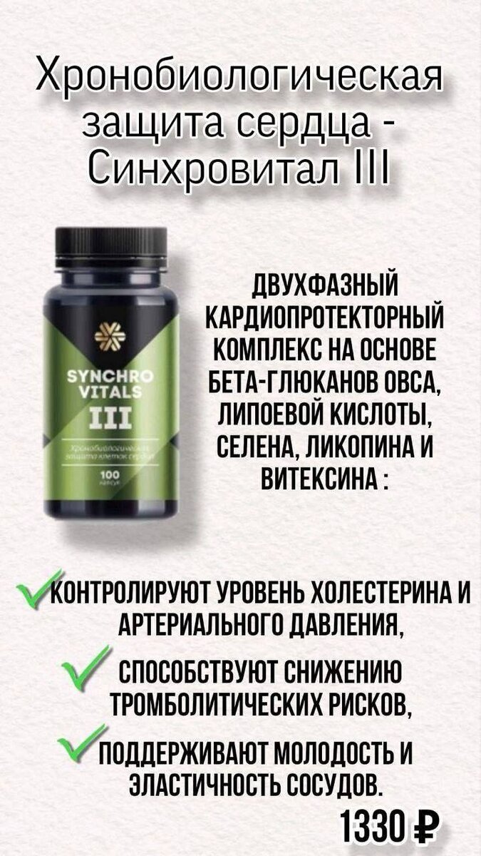 Активные компоненты утренней и вечерней формул комплекса «Синхровитал III» помогут защитить клетки миокарда, гармонизировать его биоритмы, нормализовать уровни холестерина и глюкозы в крови. Он предназначен для всесторонней поддержки работы сердечно-сосудистой системы, но его главная цель – нормализация обмена холестерина и профилактика атеросклероза.
