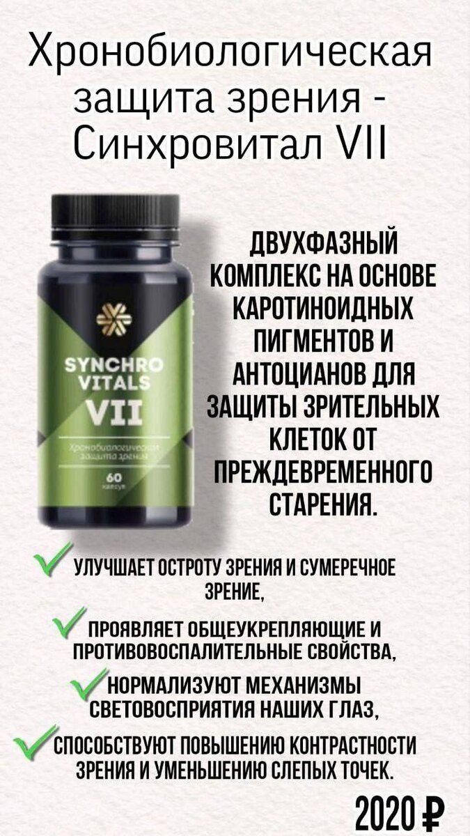 Активные компоненты двухфазного комплекса «Синхровитал VII» помогут восполнить потребность в природных светофильтрах, предотвратить преждевременное старение клеток сетчатки и хрусталика, а также гармонизировать биоритмы органов зрения.