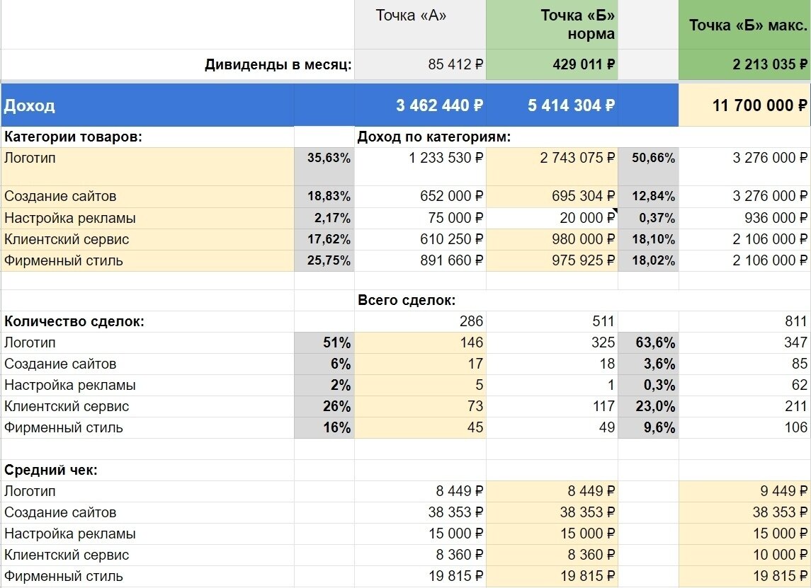 Первым шагом сделали декомпозицию целей на 5 млн и 11 млн оборота в месяц. Увидели, что есть 2 пути: пропорционально увеличивать количество сделок в месяц до 511 и 811 соответственно. Но также есть путь увеличения среднего чека.