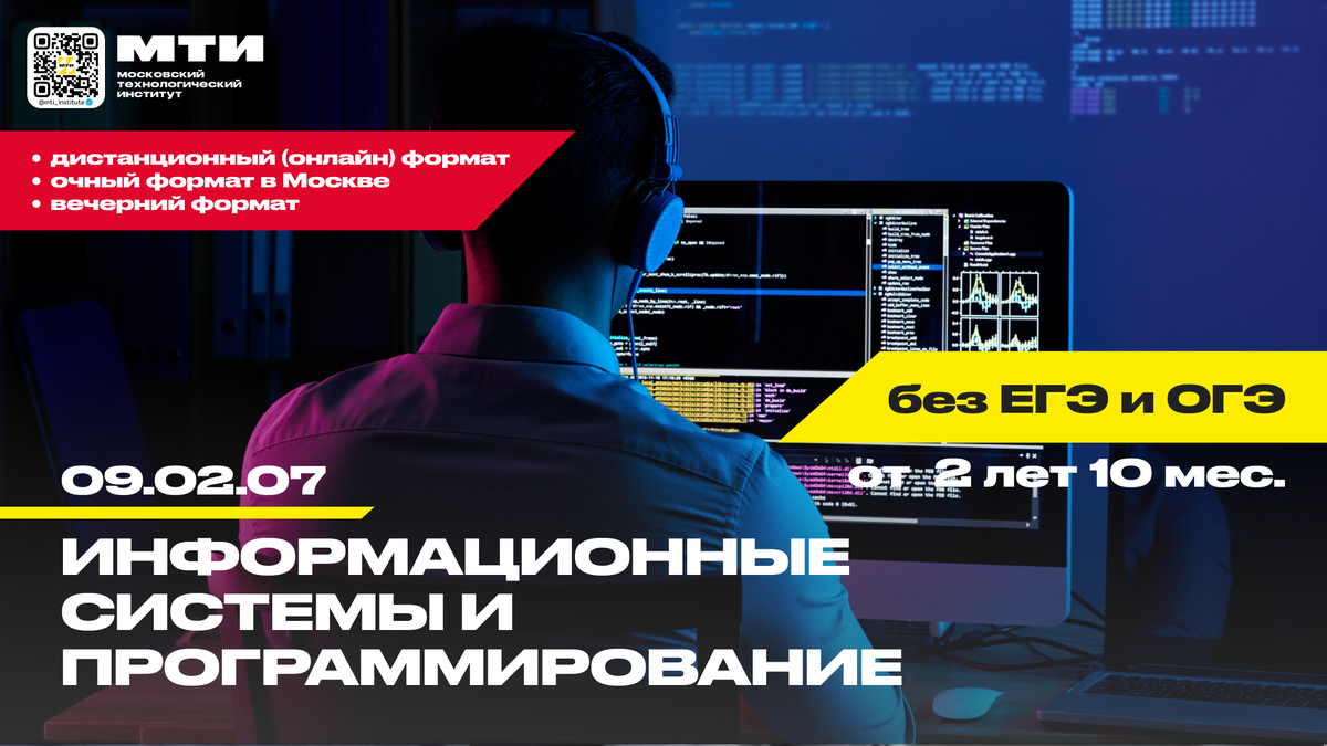 Сегодня абитуриенты всё чаще делают выбор в пользу среднего профессионального образования и поступают в колледж. Это хороший вариант для тех, кто твёрдо определился с профессией и хочет получить прикладную специальность, востребованную на рынке труда. В МТИ для поступления в колледж не нужны результаты ЕГЭ и ОГЭ. Достаточно наличие аттестата. Поступить на специальность «Информационные системы и программирование» можно после 9 или 11 класса Специальность «Информационные системы и программирование» готовит специалистов по информационным системам, которые входят в список наиболее востребованных на рынке труда, новых и перспективных профессий, требующих среднего профессионального образования (согласно Приказу Минтруда России от 30 декабря 2022 года № 831). Минимальный срок получения специальности «Информационные системы и программирование»: 2 года и 10 месяцев. В МТИ на программе 09.02.07 доступно обучение в очном или онлайн-формате и реализована возможность оплаты обучения в рассрочку. Пр
