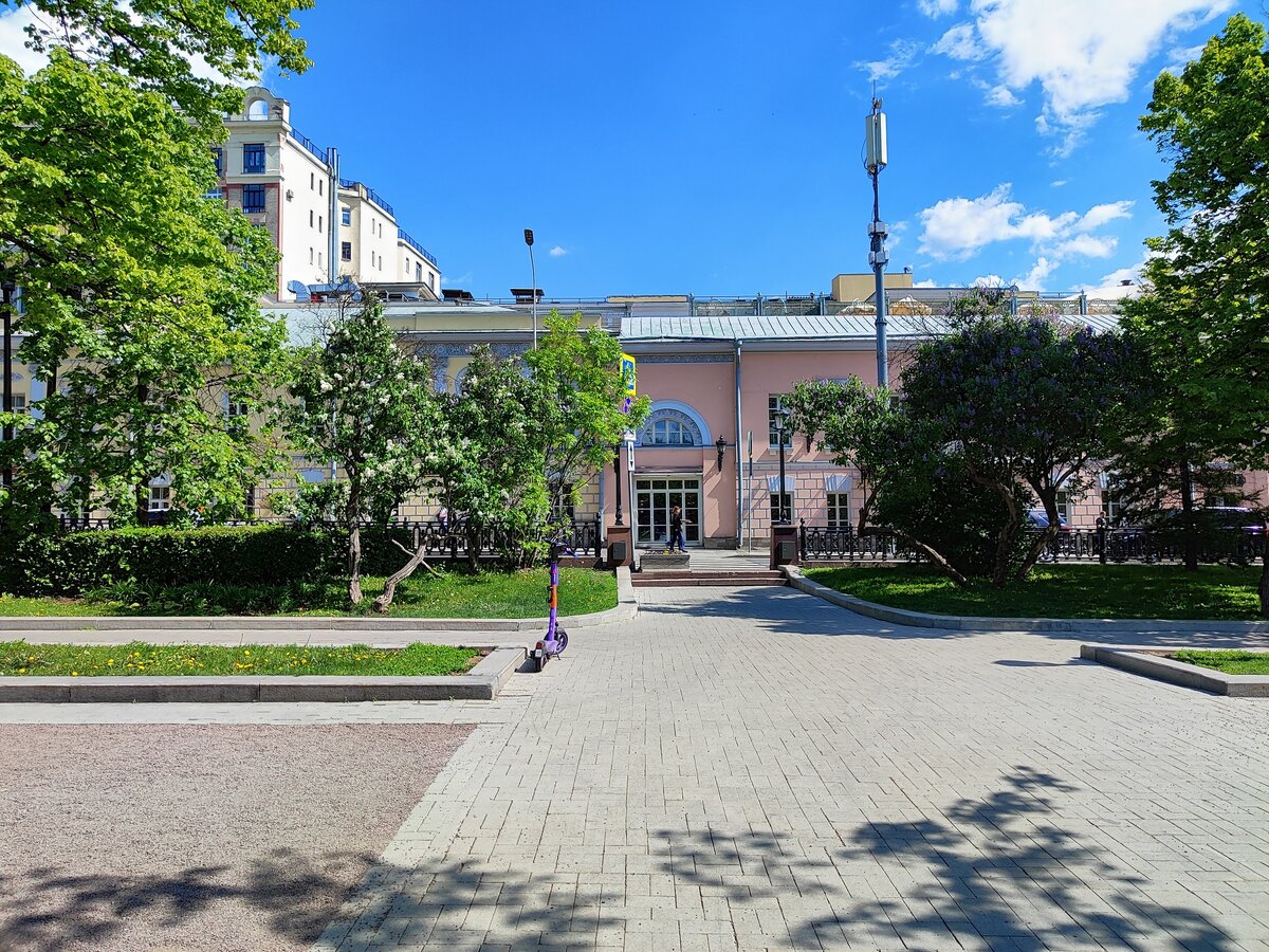 А стоит оно на месте снесенного дома Кологривовых известного тем, что там давал детские балы танцмейстер Петр Йогель. Ведь чтобы выйти на взрослый бал, девушка или молодой человек прежде должны были в совершенстве освоить искусство танца и хорошие манеры. На такие детские балы водили и маленького Александра Пушкина.
